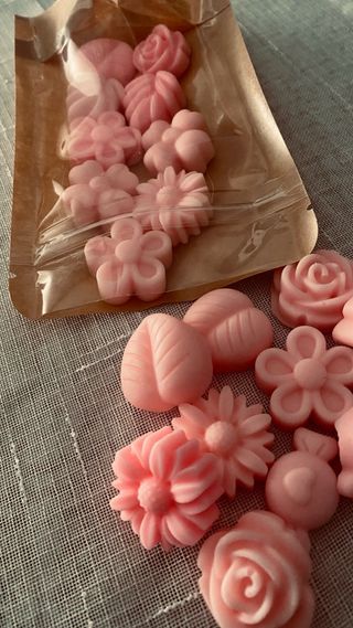 Lote de wax melts con diseños variados. - Formas de flores, hojas y corazones. - Ideales para ambientar espacios. - Aroma vainilla de la polinesia -50gr