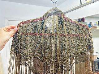 Elegante capa de fiesta con un diseño intrincado y detalles de flecos. - Adornada con abalorios dorados y detalles en burdeos. - Flecos largos y fluidos que añaden movimiento. - Diseño abierto y escotado.