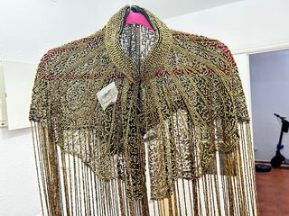 Elegante capa de fiesta con detalles intrincados y flecos. - Diseño con cuello alto. - Adornos dorados bordados en la parte superior. - Flecos largos y brillantes que caen desde los hombros. - Cinturón fino dorado incluido.