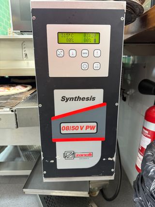 Horno de cadena ventilado Zanolli Synthesis. - Modelo: 08/50 V PW - Temperatura máxima: 320°C - Potencia: 14kw Bien mantenido y muy limpio! Mantenimientos al día Valor nuevo mas de 12.000€