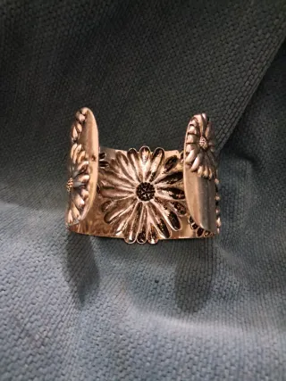 Este brazalete plateado presenta un diseño floral en relieve, con un acabado metálico que le da un toque elegante. - Diseño de flor central. - Detalles florales en los laterales. - Acabado metálico. Es perfecto, muy elegante. Tengo muchas más joyas en mi cuenta. Está nuevo, muy bien cuidado.