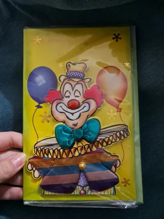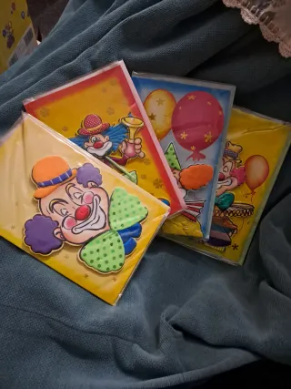 Tarjeta de cumpleaños con diseño de payaso. Son ideales para celebrar un cumpleaños divertido. Son tarjetas nuevas a estrenar, con sus envoltorios originales. Diseño alegre y colorido. Perfectas para celebrar un cumpleaños único, Son 4 modelos diferentes. Cada tarjeta cuesta 2€, los 4 por 6€. Me quedan 3 tarjetas del modelo verde, 2 del azul, 3 del naranja y 3 del amarillo. Si te interesa puedes preguntar sin compromiso.