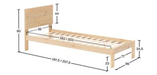 Estructura de cama individual de madera natural barnizada , ideal para colchones de 90 cm. - Medidas de largo: 197,5 / 207,5 cm. - Altura del cabecero: 90 cm. - Altura del piecero: 34,5 cm. - Ancho total: 99 cm. - Altura del somier al suelo: 23 cm. - Profundidad del somier: 92 cm. - Largo del somier: 193 / 203 cm. - Grosor del cabecero: 44 cm.