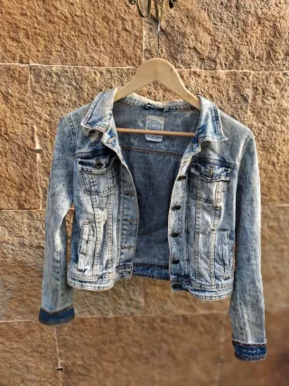 Chaqueta vaquera corta con un diseño moderno. - Estilo desgastado. - Cierre de botones. - Dos bolsillos en el pecho. - Pone talla L pero en mas bien una S, yo suelo usar una M y me queda justa