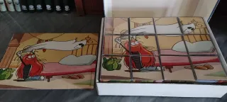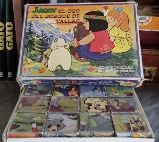 Rompecabezas infantil de los años 80 de Jacky y Nuca. No tiene las láminas de guia de las distintas imágenes que se pueden hacer. A un cubo le falta el plástico protector de un lado. La caja exterior tiene cosas escritas.