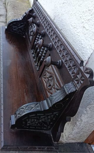 -Precioso perchero de madera oscura maciza con un intrincado tallado a mano en muy estado de conservacion y no tiene nada de polilla ni carcoma ni nada, estaba bien guardado. - Para mas fotos, videos o info hablar a este num 684612023 - Algo negociable - Unos 150-200 años de antigüedad - Diseño único y artesanal. - Acabado en tono oscuro. - Pocos en este estado