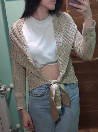 Cárdigan de punto fino en tono beige, con un diseño abierto y un cinturón de satén para anudar. - Tejido de punto con textura. - Cuello envolvente. - Cinturón de satén a juego.