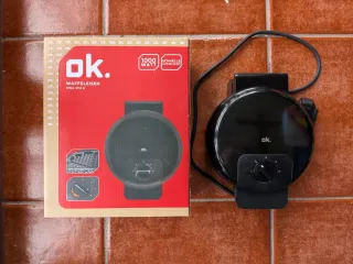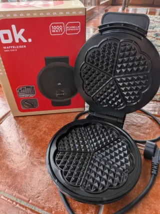 Gofrera de la marca OK., modelo OWA 3110 B. Diseñada para hacer gofres con forma de corazón. Potencia de 1000W. usado solo una vez.