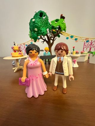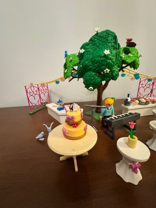 Set de Playmobil 9228 Banquete de bodas. Ideal para recrear momentos especiales. - Incluye figuras de novios y otros invitados. - Decoración temática de boda con tarta y mesa. - Elementos de jardín y árbol.