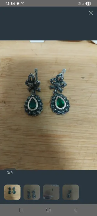 Conjunto de pendientes con un diseño elegante y detallado. - Pendientes colgantes con forma de lágrima. - Detalle de lazo en la parte superior. - Piedras centrales de color verde intenso.