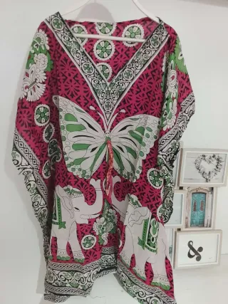 Lote de 100 pareos/vestidos 150e Vienen variados de colores - Estampado paisley y floral. - Corte holgado tipo caftán. - Escote en V. - Acabado con flecos en el bajo.