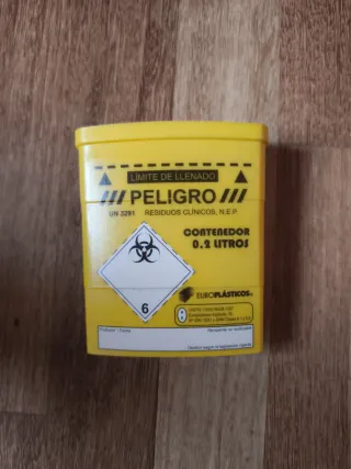 Contenedor para residuos clínicos de 0.2 litros. Diseñado para un uso seguro y eficiente. - Límite de llenado indicado. - Símbolo de peligro y residuos clínicos. - Homologado para transporte UN 3291. - Recipiente no reutilizable. - Instrucciones de destrucción incluidas.