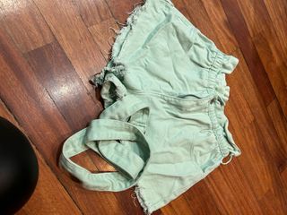 Shorts vaqueros de color verde con un diseño moderno y juvenil. - Cintura elástica con cordón. - Bolsillos delanteros con cremallera. - Bajo deshilachado. - Tirantes ajustables.