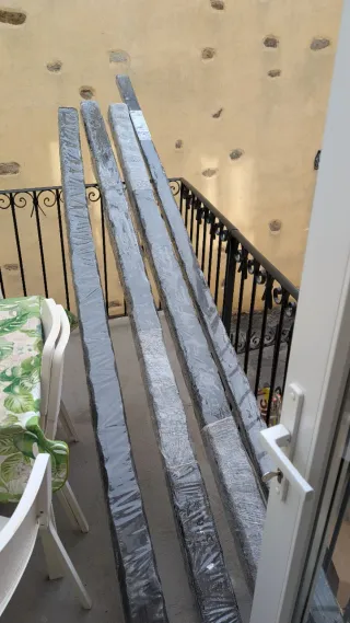 Vigas decorativas de poliespan con acabado imitación madera. - Material: Poliespan (Poliestireno expandido). - Aspecto: Imitación madera. - Uso: Decoración. - Tengo 3 de 12x12cm cortadas a aprox 2.70m (35€ c/u las 3 x 100€) y 1 de 6x9cm de 4m (32€) todo el juego se vende por 120€. -Vendo porque me han sobrado en la decoración de techo (ultima foto) - Se retiran en Saillagouse, Francia