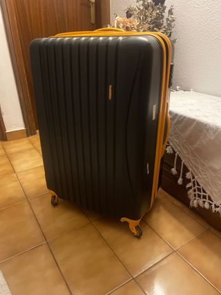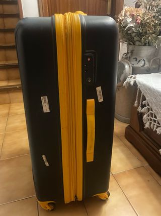 Maleta de plástico duro con gran capacidad, ideal para viajes largos. Su diseño combina el color negro con detalles en amarillo. - Material: Plástico duro. - Color: Negro y amarillo. - Tipo: Maleta de gran capacidad.