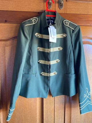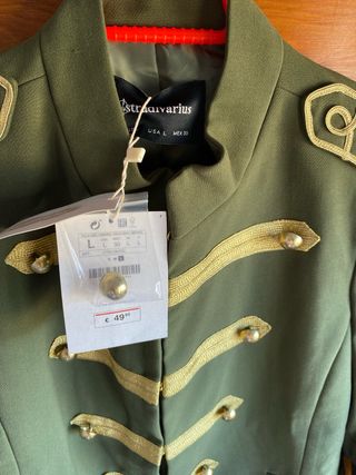 Elegante blazer estilo militar de Stradivarius. - Diseño con detalles dorados. - Hombreras decoradas. - Botones dorados. - Adornos en los puños. - Como se puede ver esta nueva con etiquetas nunca usada.