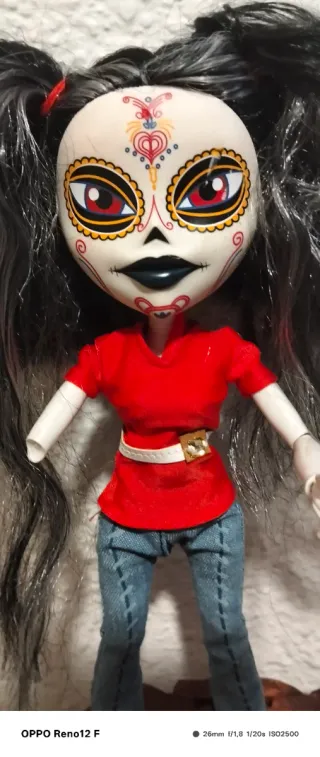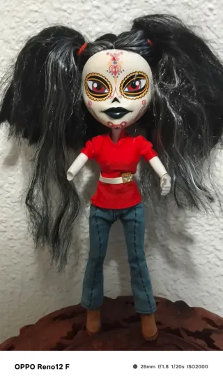 Muñeca estilo Catrina, inspirada en la tradición del Día de Muertos. - Diseño detallado en el rostro. - Cabello largo y oscuro con mechones grises. - Vestimenta: blusa roja, cinturón blanco y pantalón de mezclilla. - Botas de gamuza color miel. - Tiene un desconocido en el pantalón. - Le falta parte del brazo . - Pero esta en buen estado.