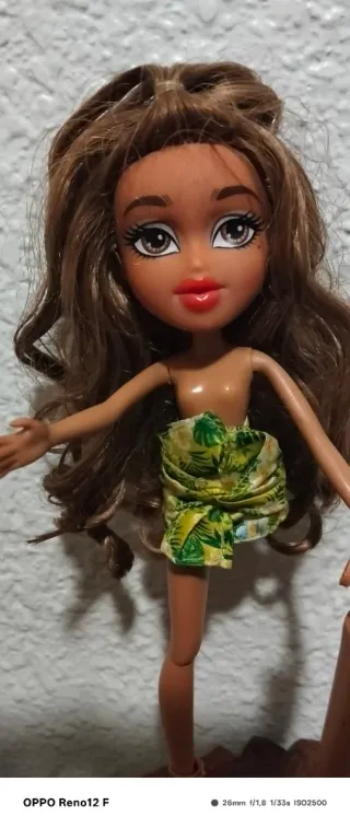 Muñeca Bratz estilo Yasmin con un atuendo veraniego. - Cabello largo y castaño. - Falda con estampado tropical. - Sandalias de plataforma amarillas. - Se vende tal cual aparece en las fotos. - La muñeca está en buen estado.