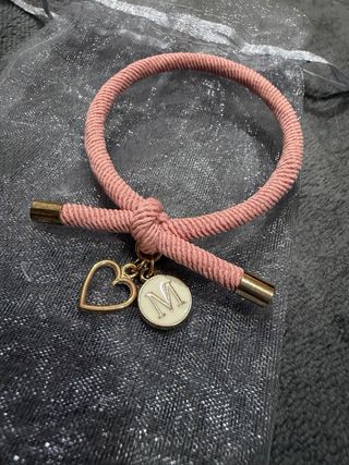 Bonita pulsera coletero elástica con un diseño moderno y un toque personal. - Charm en forma de corazón. - Charm redondo con la letra 'M'. - Cierre metálico dorado.