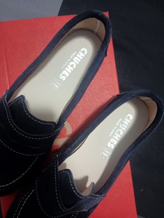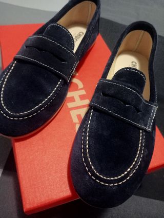 Mocasines de vestir para niño en color azul marino. Son nuevos y perfectos para ocasiones especiales. - Material: Ante - Color: Azul marino - Costuras blancas decorativas - Diseño tipo mocasín - Marca: CHUCK