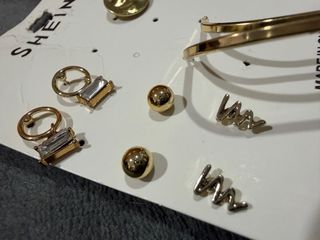 Conjunto de pendientes variados de la marca SHEIN. - Incluye 4 pares de pendientes. - Diseños circulares con detalles rectangulares. - Pendientes de bolitas doradas. - Pendientes con diseño de onda. - Pendientes grandes en forma de U. El precio es por el pack