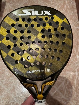 Pala de pádel Siux Electra ST4 Pro con un diseño llamativo en negro y dorado. Como nueva. Sin ningún defecto. - Diseño a cuadros en negro y dorado. - Logo de Siux en blanco. - Modelo Electra ST4 Pro.