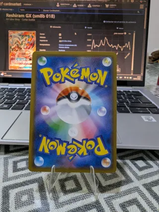 Carta Pokémon Reshiram GX, número 018 de la expansión sm8b. Estado NM - Tipo: GX - Ataque GX: Vvrmillion GX - Habilidad: Nitrocharge - Ataque: Lanza de fuego