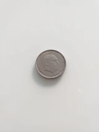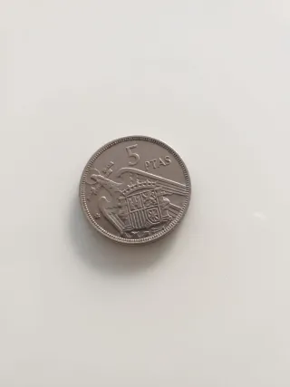 Moneda de 5 pesetas de Franco. - Año: 1957 (estrella 75). - Diseño: Águila. - Canto: Estrellas.