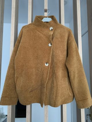 Abrigo de lana suave en color mostaza. Perfecto para mantenerte abrigada con estilo. Tiene marca de haberse quemado por la plancha. - Diseño con cuello alto. - Cierre de botones. - Bolsillos laterales.