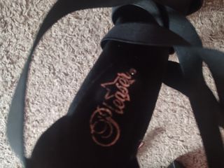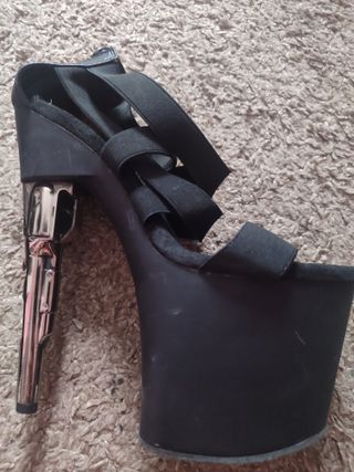 Zapatos de pole dance con un diseño único y llamativo. Los dejo a este precio porque falta una tapa del zapato izquierdo - Tacón con forma de pistola cromada. - Plataforma alta. - Tiras elásticas negras para un ajuste seguro.