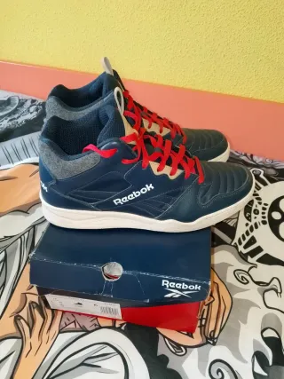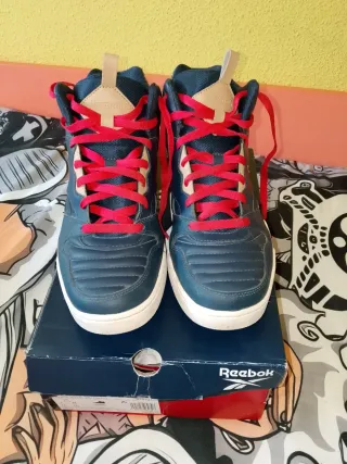 Botas deportivas de caña alta con cordones originales Reebok usados 4 veces están nuevas - Diseño en color azul marino. - Detalles en color rojo. - Suela blanca.