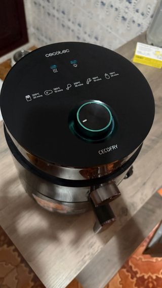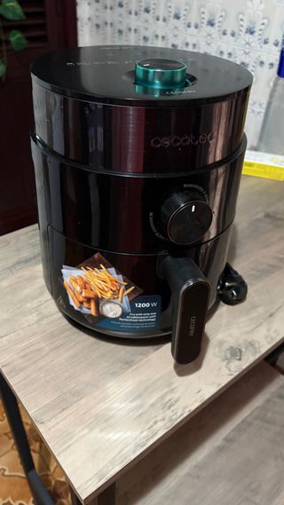 Freidora de aire Cecofry en color negro. Cuenta con una potencia de 1200W. - Diseño moderno y compacto. - Panel de control con dial. - Asa ergonómica para extracción. - Tecnología PerfectCook.