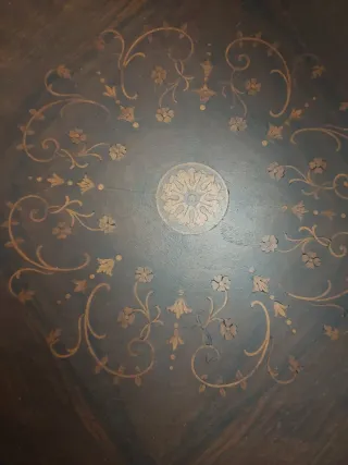 Elegante mesa redonda con un hermoso diseño de incrustaciones. - Detalles en madera clara. - Borde curvo y decorativo.