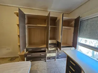Armario modular con diseño moderno y funcional. - Combinación de colores beige y marrón. - Estructura principal de madera. - Detalles y acabados en plástico.