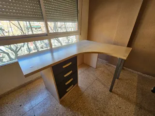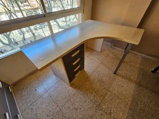 Escritorio de esquina con un diseño moderno y funcional. - Superficie amplia en color beige. - Cajonera integrada en color marrón. - Patas metálicas resistentes.