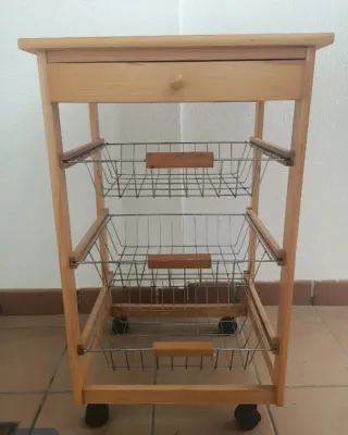 Práctico carrito auxiliar para cocina, ideal para organizar tus utensilios y alimentos. - Estructura de madera. - Cestas metálicas. - Cajón superior.