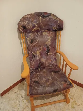 Butaca cómoda con un diseño llamativo. - Tapicería de tela con estampado. - Estructura de madera. - Respaldo alto y brazos curvos. -tiene un poco rota la tela se ve en la foto