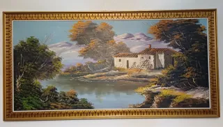 Precioso cuadro vintage que representa un paisaje sereno con un lago y una casa. - Pintura al óleo sobre lienzo. - Marco dorado con detalles ornamentales. - Escena rural con árboles y montañas.