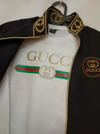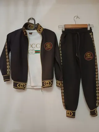 Conjunto de chándal para niño. - Chaqueta negra con detalles dorados. - Pantalón negro a juego. - Incluye camiseta blanca con logo. - Diseño con logo de Gucci. Talla 5/6 años