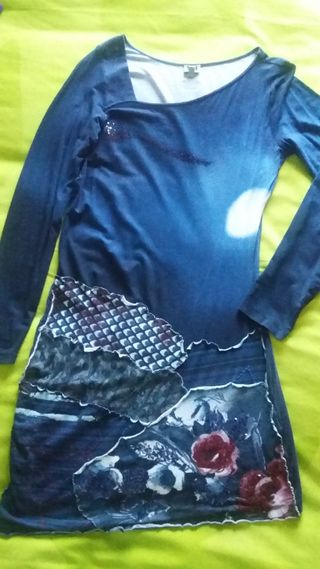 Vestido de manga larga con un diseño original y llamativo. De color azul degradado, corte asimétrico en el cuello y el bajo. Ceñido y elástico, muy cómodo y sexi. Está adornado con telas superpuestas en la parte baja. Da poca talla. Largo: 96 cm y 90 cm en la parte más corta. 95% viscosa, 5% elastano - Estampado degradado en azul. - Aplicaciones de diferentes texturas y estampados en la falda. - Flores rojas y azules en la parte inferior.