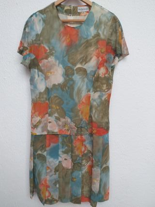 Vestido vintage con un bonito estampado floral abstracto. La parte superior es de manga corta y la falda tiene un diseño plisado.Elegante vestido estampado, tableado a partir de las caderas. Tela muy caída; está forrado. Cierra con una cremallera en la espalda. Composición: poliéster. Mide 48 cm de sisa a sisa y 95 cm de largo - Diseño de Kina Fernández. - Estampado multicolor con tonos anaranjados y azules. - Talla XL (42/14).