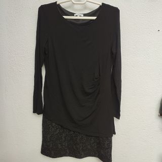Vestido negro muy cómodo con un diseño elegante.Elegante y cómodo vestido, se adapta muy bien porque es elástico. Largo a la rodilla, tiene una sobrefalda con drapeado. Mide 90 cm de largo, Talla L. Composición : viscosa, poliéster, rayón y elastano - Detalle drapeado en un lateral. - Bajo con estampado de encaje. - Manga larga.