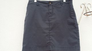 Falda de la marca Amitié.Falda a la rodilla con elastano. Azul clara, elástica, dos bolsillos en los lados. Cremallera en un lateral. Dos pequeños cinturones de la misma tela. Medidas: 60 cm de largo y 38 cm de ancho de costura a costura. Composición: algodón y elastano T 42 - Diseño con cinturón. - Bolsillos delanteros. - Costuras decorativas.