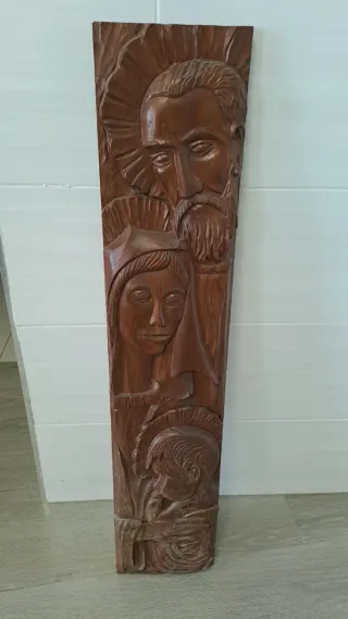 Bonita talla de madera que representa la Sagrada Familia. Una pieza decorativa con un diseño detallado. - Representación de la Sagrada Familia. - Material: Madera.