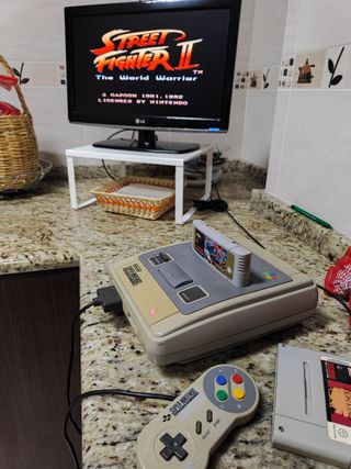 Consola Super Nintendo con dos juegos clásicos. - Incluye Street Fighter II: The World Warrior. - Incluye Rey León (Lion King). - Incluye mando Super Nintendo. - Incluye cartucho de juego adicional.