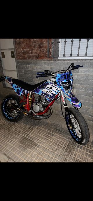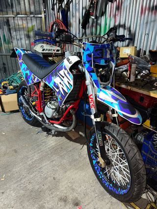 Moto Rieju RR con un diseño llamativo. - Decoración personalizada en tonos azules y blancos. - Ruedas con detalles. - Chasis rojo.