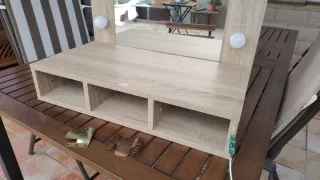 Tocador de pared con un diseño moderno y elegante. Ideal para tu espacio personal. - Marco de madera con acabado en tono natural. - Espejo central. - Luces integradas alrededor del espejo alimentado mediante USB. - No realizó envíos - No bajo el precio
