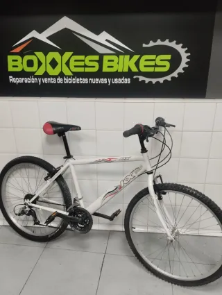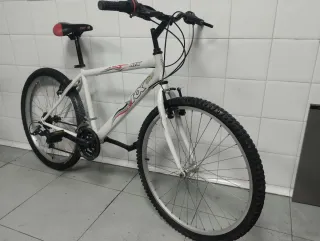 Bicicleta de montaña blanca con detalles en rojo y negro. - Ruedas de 26 pulgadas. - Cambio Shimano de 18 velocidades. talla M . revisada y puesta a punto . no negociable ni cambios. somos tienda de bicicletas nuevas y usadas con más de 100 bicicletas de todo tipo. se hacen envíos. teléfono 603 115 452