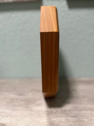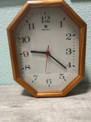 Reloj de pared con marco de madera. - Diseño octogonal. - Esfera blanca con números negros. - Agujas de hora, minuto y segundo. - Mecanismo de cuarzo.