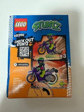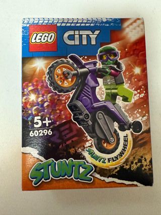 Set de Lego City 60296 Stuntz con una moto acrobática. - Nuevo, sin abrir. La caja tiene un pequeño golpe, ver fotos. - Incluye una figura de piloto. - Moto con rueda de inercia (flywheel). - Diseñado para acción y acrobacias.